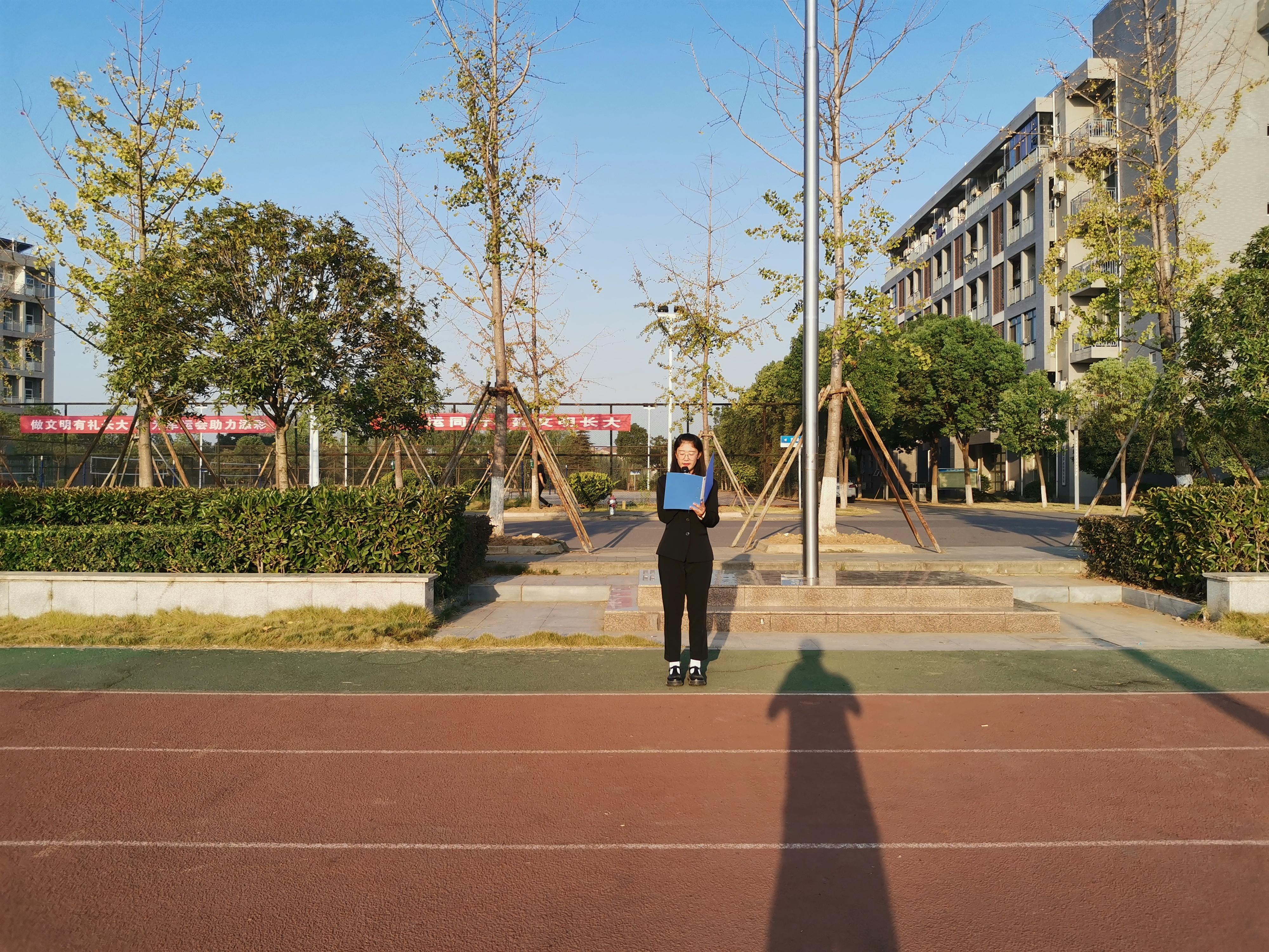 此次升旗仪式由来自地信21901班的李方越同学主持。在全体师生的注视下,英姿飒爽的国旗护卫队队员们护送鲜艳的五星红旗进场,行礼完毕,伴随着庄严而神圣的国歌,五星红旗冉冉升起,迎风飘扬。而后,全体师生举起手中的五星红旗,合唱歌曲《我和我的祖国》,用歌声诉说着中华儿女与伟大祖国之间的深厚情感。