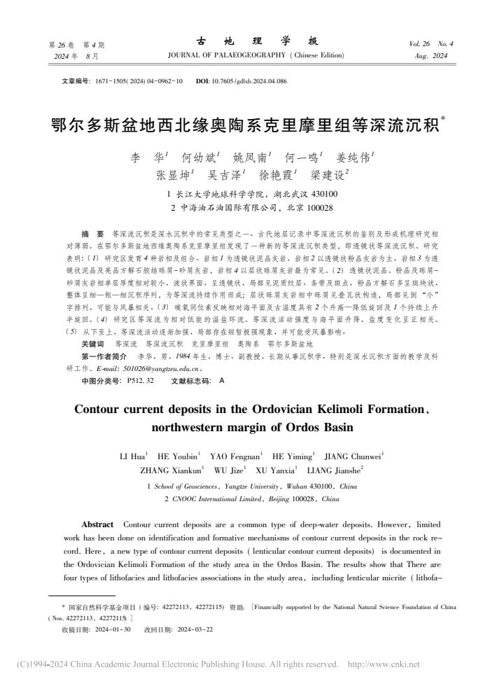 威廉希尔足球教师李华博士在《古地理学报》上发表题为“鄂尔多斯盆地西北缘奥陶系克里摩里组等深流沉积”的研究论文。