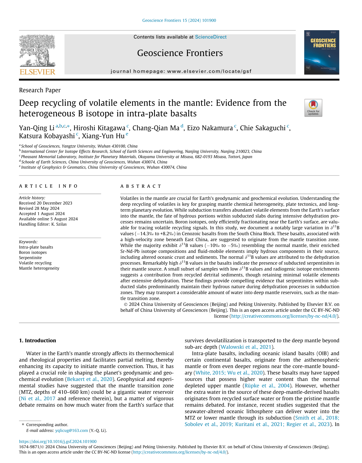 论文信息:Li Y Q, Kitagawa H, Ma C Q, et al. Deep recycling of volatile elements in the mantle: Evidence from the heterogeneous B isotope in intra-plate basalts[J]. Geoscience Frontiers, 2024, 15(6): 101900. https://www.sciencedirect.com/science/article/pii/S1674987124001245