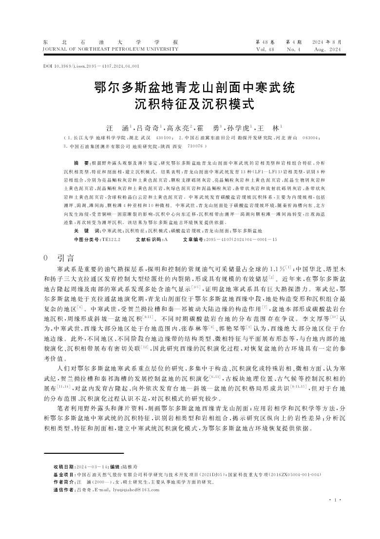 威廉希尔足球22级硕士研究生汪涵在期刊《东北石油大学学报》上发表题为“鄂尔多斯盆地青龙山剖面中寒武统沉积特征及沉积模式”的研究论文。威廉希尔足球为论文第一署名单位,硕士研究生汪涵为论文第一作者,其导师吕奇奇副教授为该文通讯作者,本项研究得到中国石油天然气股份有限公司科学研究与技术开发项目和“十三五”国家科技重大专项资助。