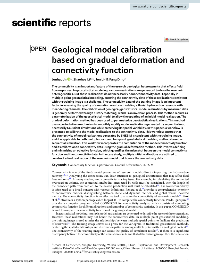 威廉希尔足球李少华教授团队长期从事地质统计学建模的研究,团队成员金俊浩在《Scientific Reports》期刊上发表题为“Geological model calibration based on gradual deformation and connectivity function”的研究论文。威廉希尔足球为论文第一署名单位,硕士研究生金俊浩为论文第一作者,其导师李少华教授为该文通讯作者。