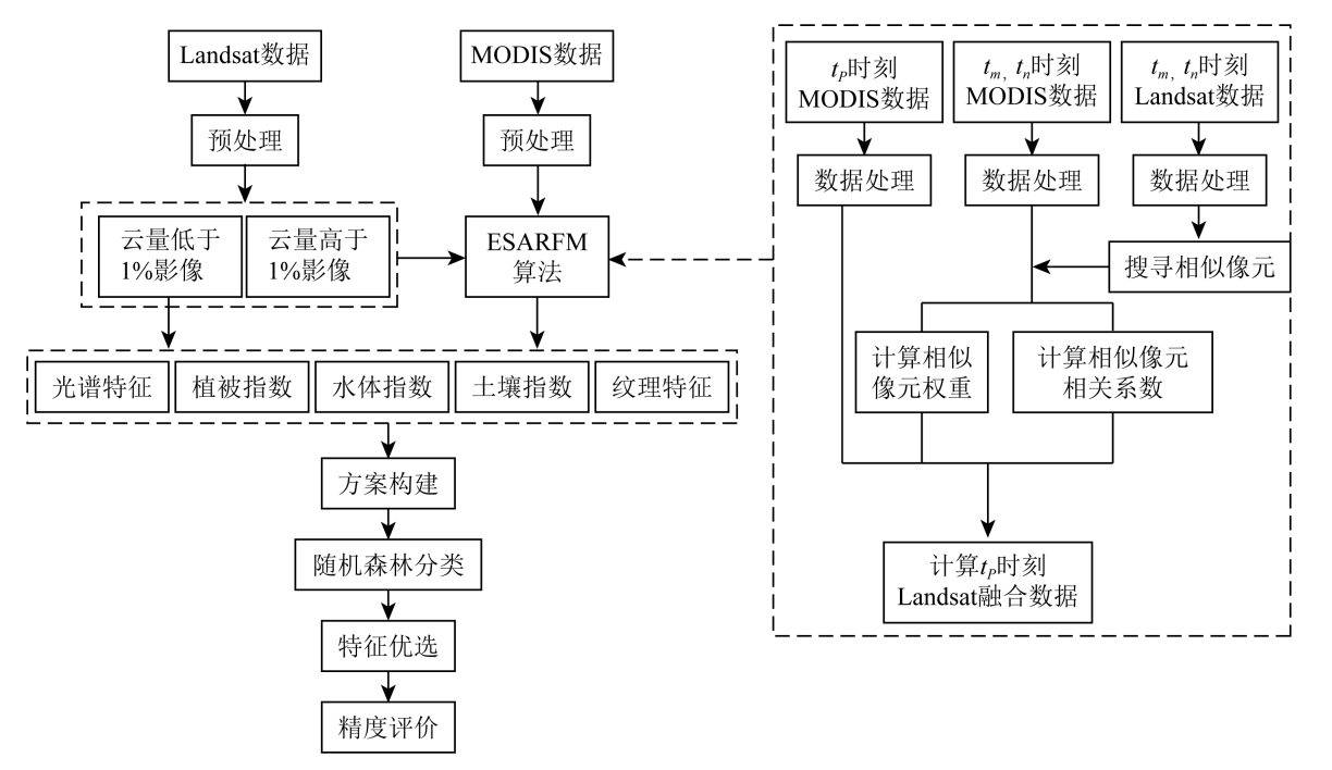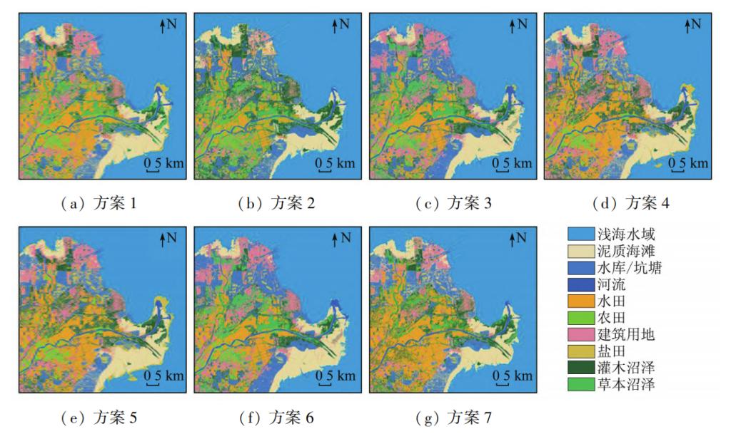 滨海湿地的遥感分类研究对于滨海湿地的保护和规划具有重要意义。为此,以黄河三角洲作为研究区,采用2019年3—10月获取的8景Landsat8OIL作为数据源,使用GEE(Google Earth Engine)云平台,根据影像的不同特征构建了7种不同的分类方案;然后,使用随机森林分类器对不同特征集合进行分类,并选择其中分类效果最好的用于绘制黄河三角洲地区的湿地类别图。其中8,9月份数据由于受到云的污染导致质量差,使用增强型自适应反射率时空融合模型(enhanced spatial and temporal adaptive reflectance fusion model,ESTARFM)算法对有云区域进行填补处理。结果表明:①ESTARFM时空融合模型生成的预测影像与真实影像波段表现出较好的相关性,其R值均能达到0.73以上,说明重构的影像可以用于本研究;②使用随机森林算法对研究区地物类型进行分类,其中方案7通过特征优选,分类结果总体精度达92.28%,Kappa系数达0.91,分类结果与湿地实况相吻合,比常规方案分类精度更高。研究结果有助于了解和掌握该区域湿地不同类型的空间分布特征,可为区域生态环境的保护和规划提供科学依据。
