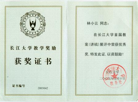 (11)1993~1994、1994~1995、1999~2000、2000~2001学年获江汉石油学院教学质量优秀奖。2005~2006、2007~2008学年获威廉希尔教学质量优秀奖。